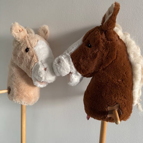 Hevosen pää on pehmeää, nukkapintaista materiaalia ja harja on vaaleaa lankaa.Tämä myynnissä ilman keppiä.