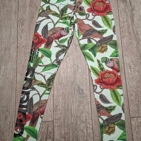 Adidas naisten treenitrikoot, joissa kaunis kukka-aiheinen kuvio mustalla pohjalla. Koko 34. Joitain pieniä käytönjälkiä voi olla.