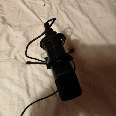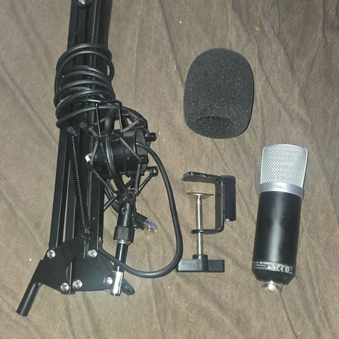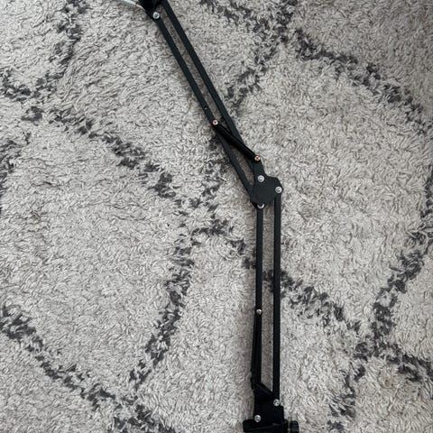 Musta pöytään kiinnitettävä mikkiteline, jossa mukana johto ja shock mount. Itse pöytään kiinnitettävä osa puuttuu.