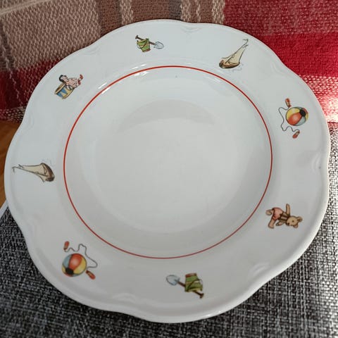 Puurolautanen Markus-sedän lasten tunnin ajoilta. Ahkerasti on puuroa lusikoitu, joten lasite ja siirtokuvat jo kovin kuluneet. Jonkin verran tummentumaa myös lasitteen alla, mutta ehjä. Kuvat tunnistamattomia satuhahmoja? Kolmen A:n masuunileima (1928-1932). Halkaisija 20,5 cm ja korkeus 3cm.