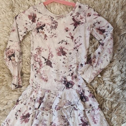 Gugguu mekko tytöille, koko 110. Pitkähihainen malli, jossa on kerroksellinen helma. Materiaalina puuvilla. Väriltään kirjava, vaalealla pohjalla perhos- ja kukkakuosia.
