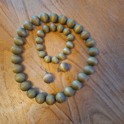 Aarikan vanhoja puu/metalli kaulakoruja, yksi rannekoru