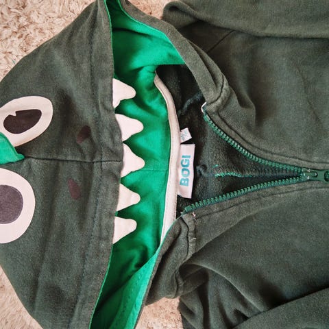 H&M lasten haalari dinosauruskuosilla. Koko 110, unisex-malli. Vihreä väri, pehmeää polyesteriä. Haalarissa on huppu, jossa on silmä- ja hammasaiheinen koriste sekä takana kangaspiikit. Edessä on vetoketju helpottamassa pukemista. Materiaali 100 % polyesteriä. Käytönjälkeä on, mutta hauska oloasu tai naamiaisiin. Häntä puuttuu.
