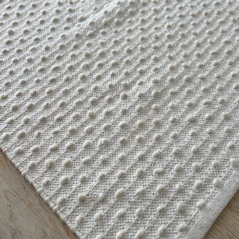 Materiaalina puuvilla, valmistettu Intiassa. Matossa on pehmeä nukkapinta ja hillitty, viivamainen kuviointi. Nurkissa hauskat tupsut.