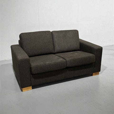Hakusanat: sohva, sohvat, kolmen istuttava, harmaa, huonekalu, huonekalut, puujalat, napitettu, käytetyt huonekalut