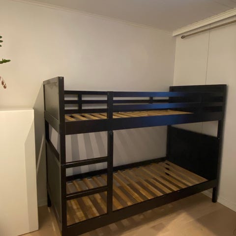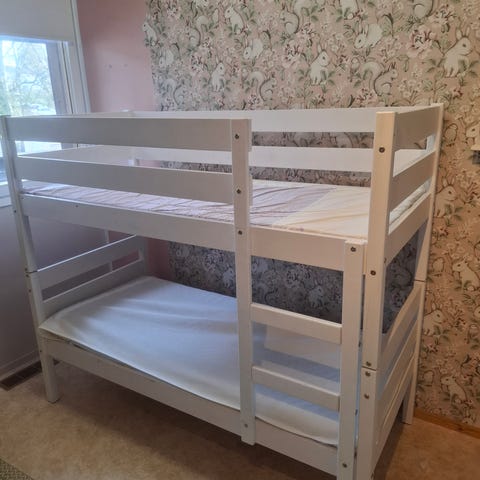 kerrossänky lapsille. Valkoinen puinen runko, jossa tikkaat sivussa helpottamassa yläpedille nousua. Sängyssä on kaksi nukkumatasoa, joista alempi on lähellä lattiaa. Kuvassa näkyy lisäksi erillinen laatikosto tai säilytysratkaisu sängyn alla, joka voi tarjota lisäsäilytystilaa vuodevaatteille tai leikkikamoille. Sopii lastenhuoneeseen kahdelle lapselle tai lisävuoteeksi kaverille yökyläilyä varten.