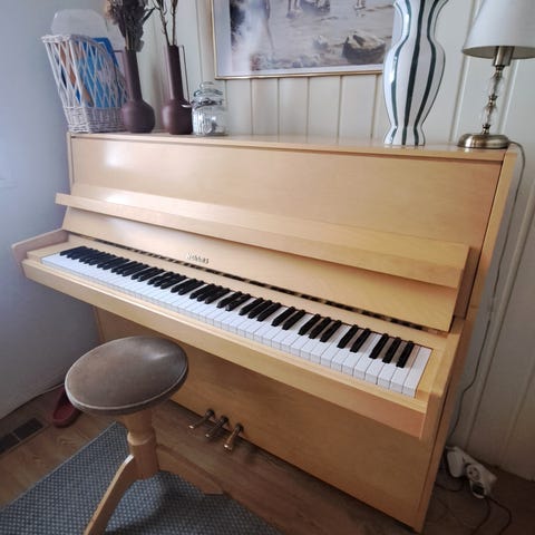 Hellas pystypiano vaaleaa puuta. Pianossa on täysikokoinen koskettimisto ja kolme poljinta. Runko ja etupaneelit ovat vaaleasävyistä puuviilua. Kuvissa näkyy lisäksi vaalealla istuinosalla varustettu, puujalustainen pianotuoli. Soveltuu kotikäyttöön ja pianonsoiton harjoitteluun.
