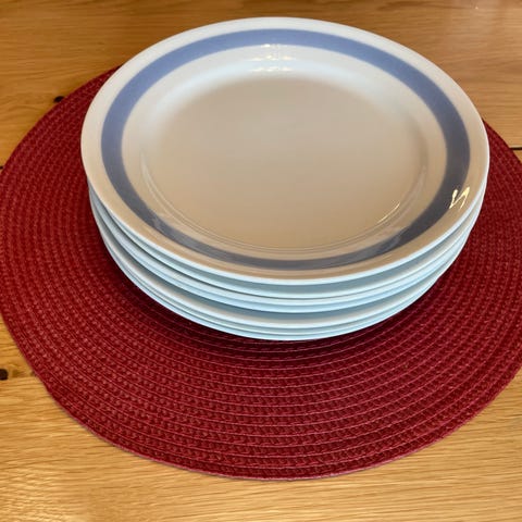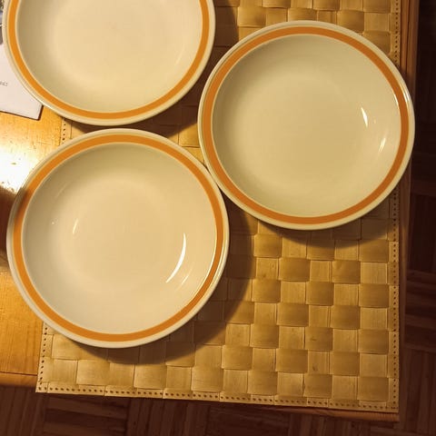 Matalat ruokalautaset Aprikoosi-sarja Arabia. Halkaisija 24cm. Design Kaarina Aho.