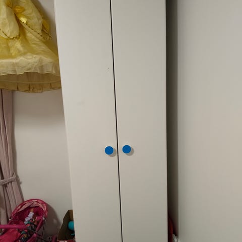 Uusi korkea kaappi, jossa vaalean harmaa täyskorkea ovi (väri nähtävissä kuvasta).
