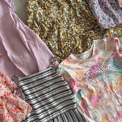 Kesävaatepaketti koossa 122/128. Siistejä, jotain pientä käytönjälkeä voi löytyä. Mukaan pakettiin saa toisessa kuvassa olevan t-paidan, joka pesussa vähän harmaantunut.