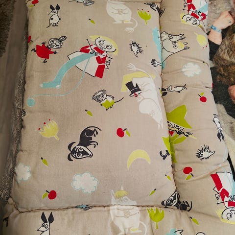 Familon Muumi lastenpeitto ja tyyny vaaleanpunaisella kuosilla.