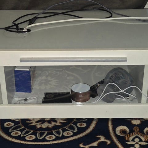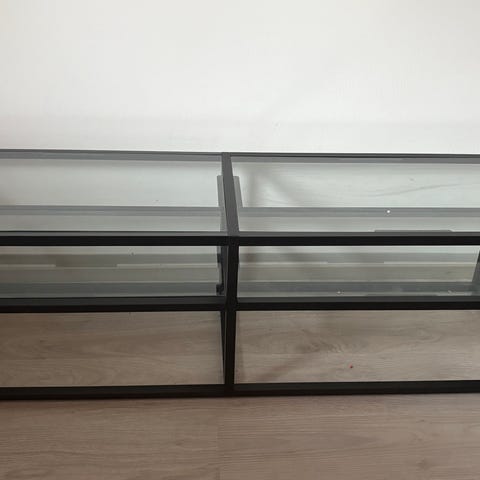 Tasossa lasiset hyllyt, jotka saa otettua pois siirron ajaksi. Vetolaatikot toimivat moitteetomasti. Tv-tason takareuna ”aukinainen”, tämä näkyy kuvissa. Tason mitat kuvissa.