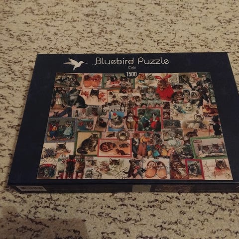 Bluebird Puzzle Dogs -palapeli, jossa on 1500 palaa. Kuvassa on useita koira-aiheisia vintage- ja postikorttimaisia kuvia kollaasina. Sopii aikuisille ja vanhemmille lapsille, jotka pitävät yksityiskohtaisista ja monivärisistä palapeleistä. Valmistettu kartongista.