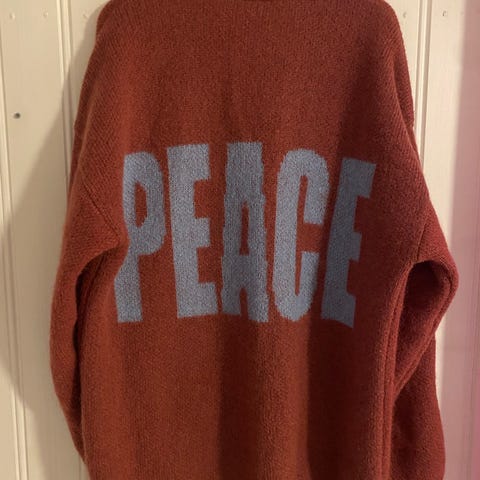 Vimma neuletakki, väri musta. Koko one size. Materiaalina mohairvillasekoite (50 % mohair, 30 % polyamidi, 20 % merinovilla). Edessä napitus ja pitkät hihat. Takana suuri kontrastivärinen love teksti. Käytetty vähän, hyvä kunto.