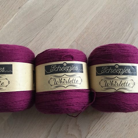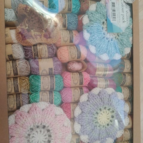 Setti sisältää kuvassa näkyvät langat, silmukkamerkit ja kangaskassin.