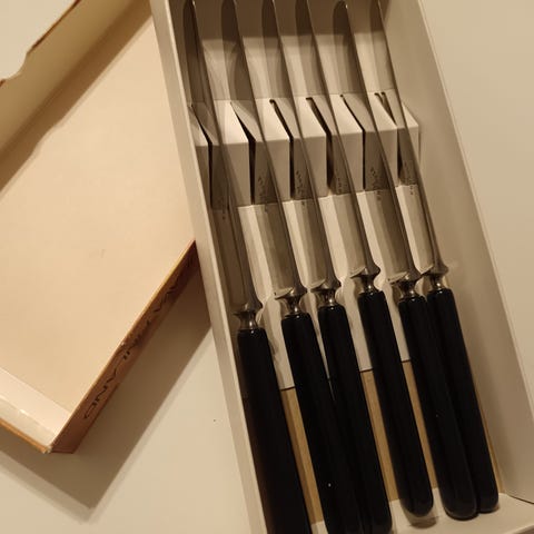 Zwilling pöytäveitset, 3 kappaleen setti. Veitsissä on teräksinen terä ja koristeelliset hopeanväriset varret. Terissä on Zwilling-logo. Sopivat esimerkiksi kattaukseen ruokaveitsiksi. Veitsissä näkyy käytön ja iän tuomaa patinaa sekä kulumaa.