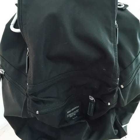 Marimekko kangasreppu unisex-käyttöön. Reppu on valmistettu kankaasta ja siinä on säädettävät olkahihnat. Mustalla pohjalla on vaalea pilkkukuosi. muutama huomaamaton tahra etuosassa. reppu on juuri pesty