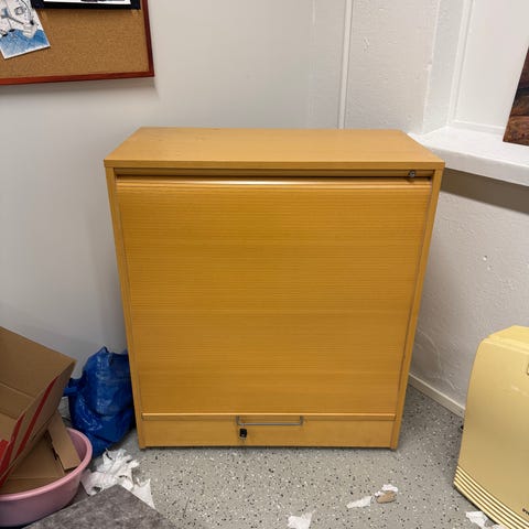 Pienellä kunnostuksella käytännöllinen rulokaappi kirjoituspöytänä koululaiselle tai säilytykseen.