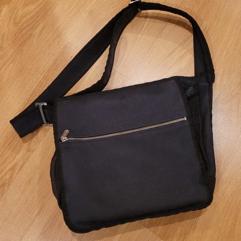 Marimekko urbaani olkalaukku unisex-käyttöön. Materiaalina kangas. Laukussa on pitkä, säädettävä olkahihna, etupuolella vetoketjutasku sekä läppä, joka sulkee pääosan. Sisäpuolella on useampia lokeroita pienten tavaroiden säilytykseen. laukku on vanha ja siinä on käytön jälkiä