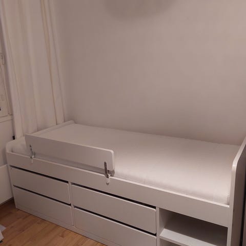 IKEA sänky säilytyslaatikoilla. Valkoinen runko, jossa useita vetolaatikoita ja avohyllyjä pitkällä sivulla. Sängyssä on sälepohja. Soveltuu yhden hengen sängyksi ja tarjoaa integroitua säilytystilaa esimerkiksi vaatteille, vuodevaatteille tai leikkikamoille. Rakenne puumateriaalia ja lastulevyä/vaneria yhdistäen (tyypillinen IKEA-sänkyjen materiaali).