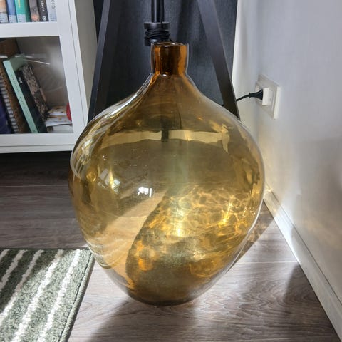 Myydään kaunis lasipullo, johon on itse juuttinarusta punottu koristeet. Haku Tapaninkylästä. Korkeus n.33cm