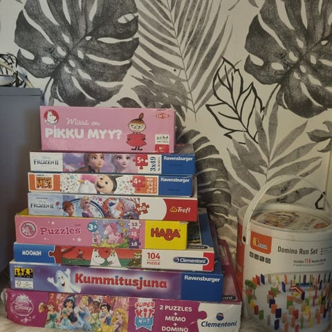Planes pelisetti. Mukana kaksi palapeliä, domino ja muistipeli. Kaikki osat oli tallella kun tarkistin. Vaihtuu Juhlamokka suodatinkahvipakettiin.