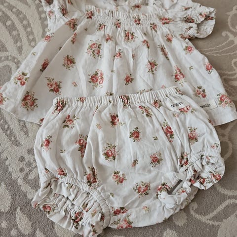 Newbien kesäinen vauvan setti. Kukkakuosi ja pitsisomisteet. Hyvä kunto, pari kertaa käytetty.