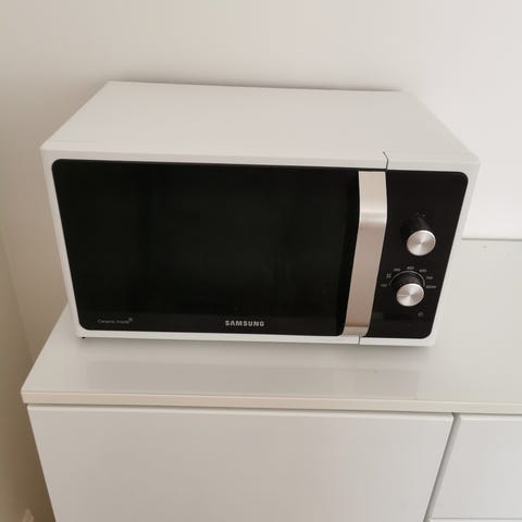 Etupaneelissa on digitaalinen näyttö ja painikkeet automaattiohjelmille, sulatukselle, kellolle ja lapsilukolle sekä pyörösäädin tehon ja ajan säätöön.