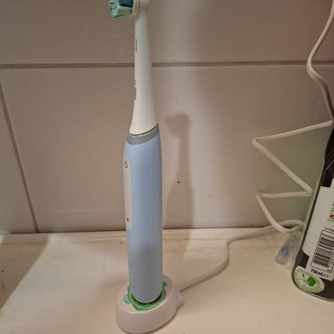 Oral-B Professional Care sähköhammasharja. Mukana tulee latausteline virtajohdolla sekä yksi vaihdettava harjaspää. Jäi ylimääräiseksi uuden hankinnan tieltä.