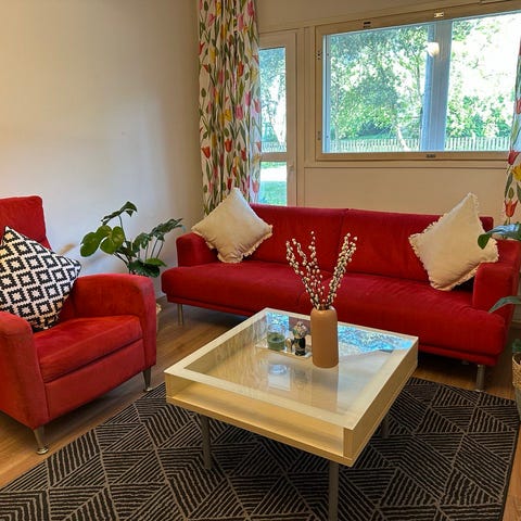 Myynnissä vaaleanpunainen Cosy nojatuoli. Tuoli on ajaton ja moderni. Nojatuolin runko ja jouset ovat ehjät. Istuin ja selkätyynyn kangas on irrotettavissa pesuun. Korkeat jalat mahdollistavat helpon puhtaanapidon tuolin alta. Huomioitavaa tuolin kunnossa: Nojatuoli on ollut koirataloudessa. Tästä johtuen istuin ja selkätyynyjen alla olevassa rungonkankaassa hieman koirankarvoja. Lisäksi kapeakäsinojaisten nojatuolien tyyppivika tästäkin löytyy. Käsinojan pehmuste painunut hieman sivullepäin. Runko ehjä. Tästä hieman väriä ja istuinmukavuutta varmasti joka eurolla. Nojatuolin hinta: 219€. ALENNETTU HINTA: 197€.