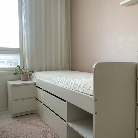 IKEA sänky säilytyslaatikoilla, väri valkoinen. Sängyn runko on laatikkomallinen, ja molemmilla sivuilla on useita ulosvedettäviä säilytyslaatikoita esimerkiksi vaatteille, vuodevaatteille tai matkatavaroille. Rungon materiaali on maalattua puukuitu-/lastulevyä tai vastaavaa kalustemateriaalia. Sänky sopii kahdelle hengelle. Kuvissa näkyvät patjat ja päälliset voivat antaa osviittaa koosta, mutta tarkat mitat eivät käy ilmi kuvista.