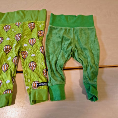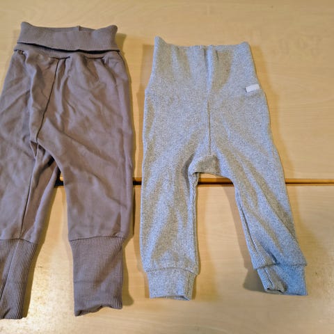 Vauvan housut koossa 68. Toisissa housuissa valkoinen pohjaväri ja tassukuvioitu kangas, punaiset housut Reima-merkkiset. Molemmissa joustava vyötärö ja lahkeensuut, materiaali pehmeää trikoota.