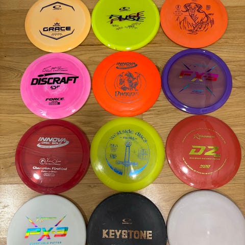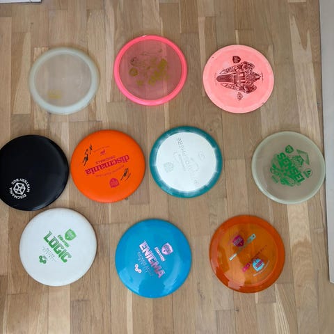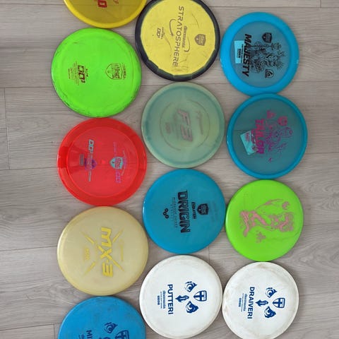 Sekalainen frisbeegolfkiekkojen setti. Useita eri valmistajien kiekkoja, mukana sekä draivereita että mahdollisesti lähestymis- tai puttikiekkoja. Kiekot ovat eri värejä ja niissä on erilaisia painatuksia. Sopii pelaajalle, joka etsii useamman kiekon kokonaisuutta frisbeegolfiin. Tarkemmat mallit, painot ja muovitiedot voi tarkistaa kuvista tai kysyä.