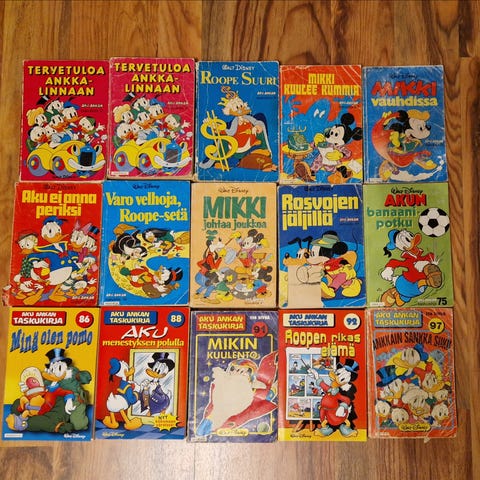 Myynnissä vanhoja Aku Ankan taskukirjoja 1960–70-luvuilta. Useita varhaisia numeroita ja osa 1. painoksia.