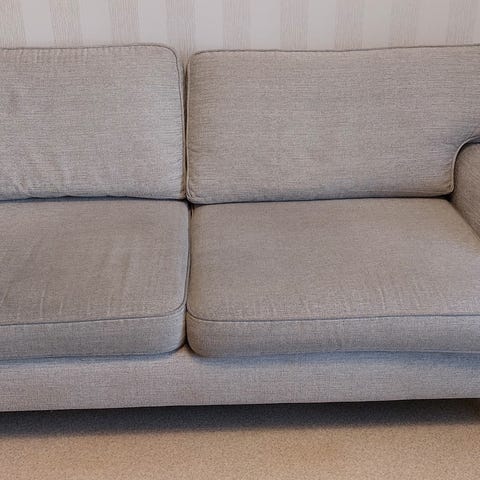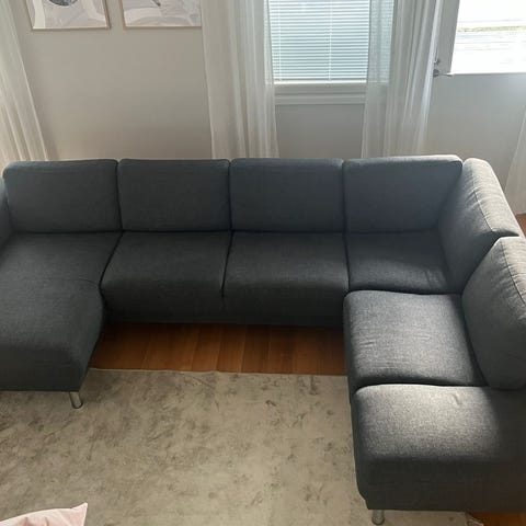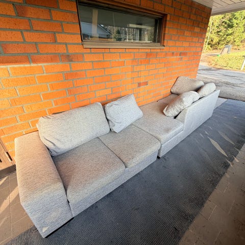 Myydään iso harmaa sohva. Sohvan saa kolmeen osaan helposti hakakiinnikkeiden ansiosta. Sohvassa muutama tahra, mitkä lähtee pestäessä pois. Koiratalous.