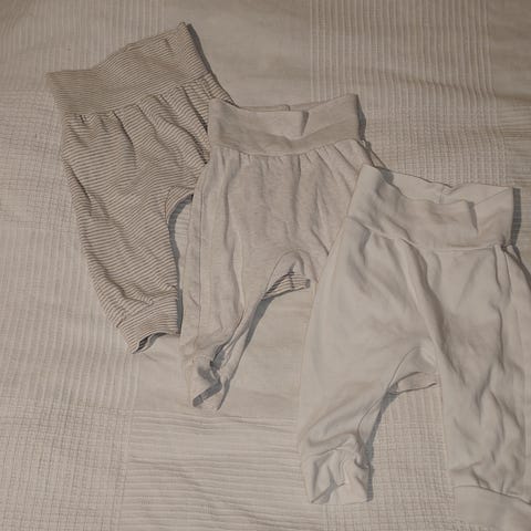 Vaatepaketti, jossa kuudet housut. Koko 68, merkit mm. Bamse, Reima, HM. Housut pääosin harmaan ja tummansinisen sävyissä.