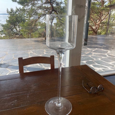 Myydään 55 cm pitkä lasinen kynttilänjalka. Puuta ja lasi. Teksti: Välkommen hem till oss. Upea ja näyttävä. Ihana mökille tai kotiin 🩷