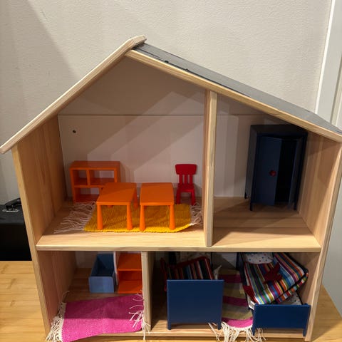 Ikea flisat nukkekoti. Löytyy pientä käytönjälkeä (kuvat), kuitenkin siisti vielä seuraavalle leikkijälle. Voidaan kiinnittää seinään.