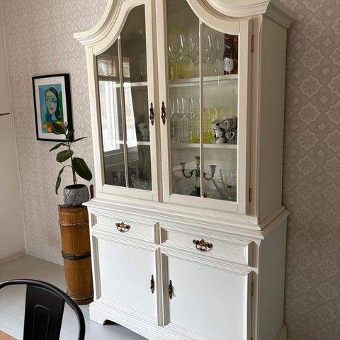 Esimerkiksi astiakaapiksi soveltuva lasivitriini. Vitriinin yläosassa on ollut lamppu mutta johto on katkennut.