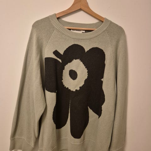 Marimekko Lohdukas, koko M. Väri valkoinen, edessä suuri vaaleanpunasävyinen unikko. Materiaali puuvillaa. Pitkät hihat, pyöreä pääntie ja resorit helmassa, hihansuissa ja pääntiellä. Sopii arkipukeutumiseen ja kerrospukeutumiseen.