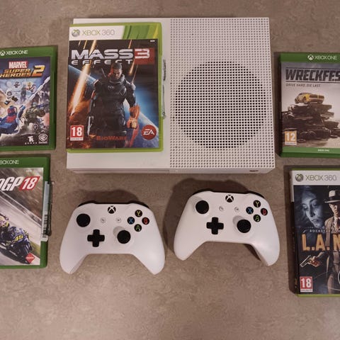 Xbox One S 1tb + 2 ohjainta, 5 peliä ja virta+hdmi johto mukaan