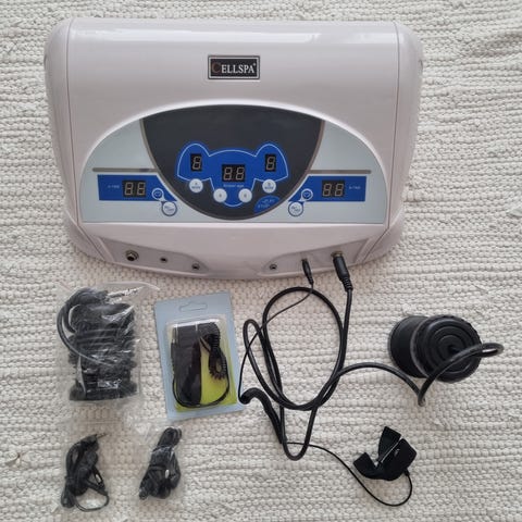 Käytetty Detox spa kehon puhdistuslaite. Paketti sisältää laitteen, 2 kpl infrapunalämpövyötä, 2 kpl rannekkeita, 1 kpl uusi eletrolyysilaite, virtajohdon, säilytysboxin. Mukaan tulee 3 kpl käytettyjä eletrolyysilaitteita sekä käyttöohjeet. Hinta uutena 1400 €.