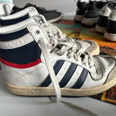 Käytetty paljon, mutta juuri pestyt mukavat lenkkarit. Koko pienehkö 36, mielestäni sopii enemmän 35,5. Ulkopuolelta ehjät, sisällä kantapäiden kohdalla pienet reiät.