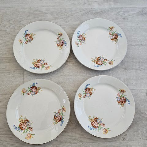 7kpl Arabian kukkia lautasia vihreällä reunalla, OZ. Takana merkintä II:a Made in Finland, 2kpl 83 numerolla ja 5 kpl 88 numerolla. Vihreä reuna kulunut kaikista vähän ja epätasaisesti. Käytetty kunto, mutta ehjiä. Voin myydä myös erikseen, 3€/kpl +postit. Halutessaan saa kaupan päälle 3 lautasta lisää, joissa kaikissa yksi lohkeama. Lautasten halkaisija vaihtelee 16-16,5cm, samoin koveruus vaihtelee.