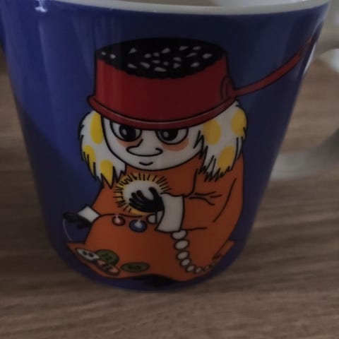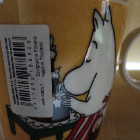 Arabia Muumi-muki keltainen. Posliininen muki, jossa Muumi-hahmojen kuvitus keltaisella taustalla. Sopii esimerkiksi kahvi- tai teemukiksi arkeen ja kattauksiin. Pohjassa Arabia Finland -leima ja Muumi-kuvitus.