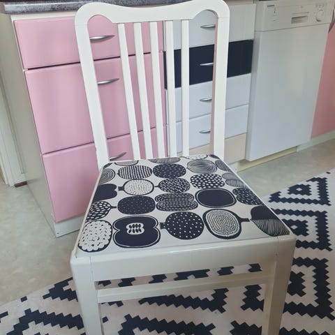 Ylimääräiseksi jäänyt Askon piippuleimalla varustettu pehmustettu puinen keittiötuoli. Tuoli on ehjä, tukevarakenteinen ja siistikuntoinen. Normaalia ajan patinaa hieman puuosissa on. Edustaa siis sitä ajanjaksoa, kun Asko valmisti keittiökalusteet vielä Suomessa ja Lahdessa. Tuolin istuimessa oleva vihreä kangaspäällinen on helppo vaihtaa halutessaan, mikäli ei miellytä silmää. Tuoli on mitoiltaan: