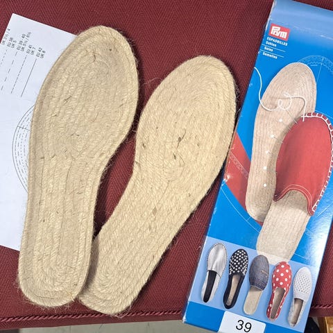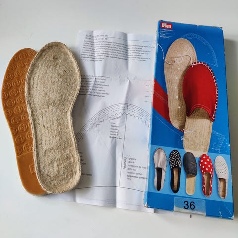 Tee itse espadrillot. Vaalea, luonnonkuitu ja kuminen pohja, jossa kuviointi. Toimitukseen kuuluu myös ohjepaperi, jossa on mitoitus- ja leikkausohjeita pohjallisten muokkaamiseen oikeaan kokoon ja muotoon.