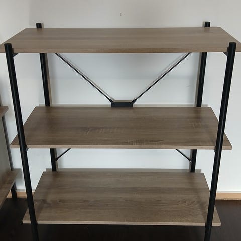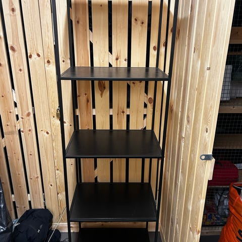 Siisti hyllykkö, jossa tukeva metallirunko.