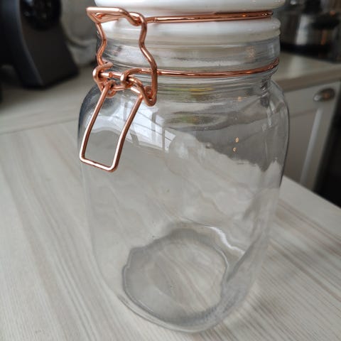 Myydään lasinen säilytyspurkki. Korkeus 16cm, leveys 15,5cm. Voidaan asettaa kahteen asentoon.