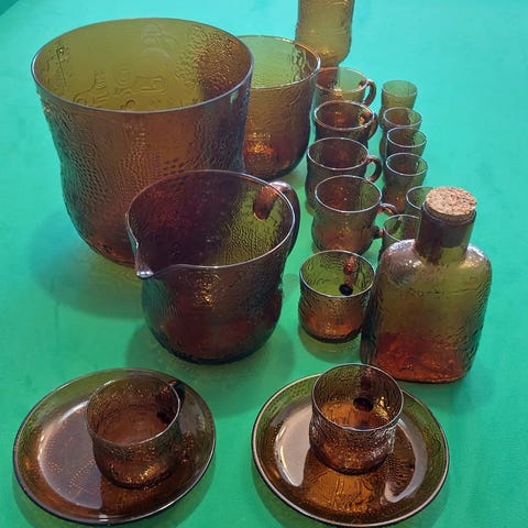 Iittala fauna kulho halkaisija 13 ja korkeus 12.5 senttiä. Kaksi lasia ja kaksi pientä kulhoa. Nouto Inkeroisista.
